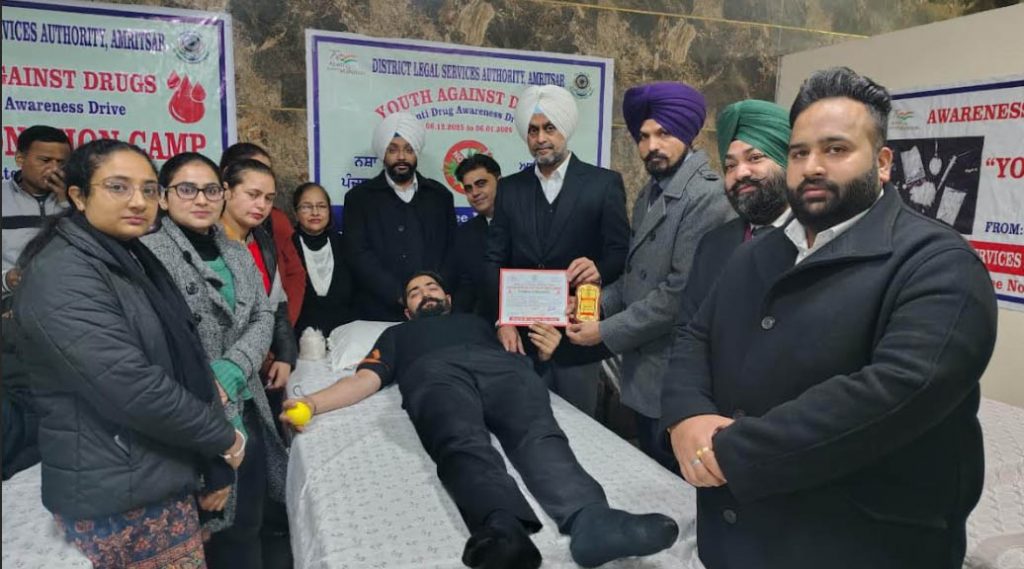 कल्याण केसरी न्यूज़, अमृतसर, 06 जनवरी 2026: जिला कानूनी सेवाएं प्राधिकरण, अमृतसर द्वारा सिविल सर्जन, अमृतसर के सहयोग से आज जिला अदालत परिसर, अमृतसर में स्थित जिला बार एसोसिएशन के कार्यालय में रक्तदान शिविर का सफलतापूर्वक आयोजन किया गया। यह शिविर एक माह तक चली “यूथ अगेंस्ट ड्रग्स” अभियान के समापन अवसर पर लगाया गया, जिसका मुख्य उद्देश्य नशों के विरुद्ध जागरूकता फैलाना तथा रक्तदान को एक महत्वपूर्ण मानवीय सेवा के रूप में प्रोत्साहित करना था।