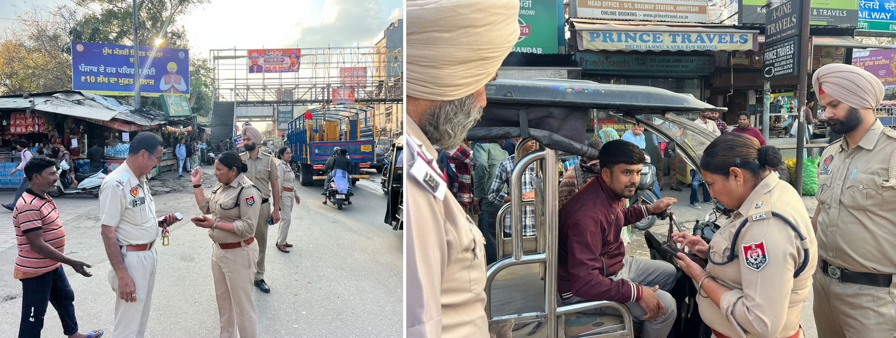 माननीय कमिश्नर पुलिस, अमृतसर श्री गुरप्रीत सिंह भुल्लर, आईपीएस के दिशा-निर्देशों के अनुसार, अमनदीप कौर, पी.पी.एस., अतिरिक्त डिप्टी कमिश्नर पुलिस, ट्रैफिक एवं सड़क सुरक्षा, अमृतसर द्वारा जोन इंचार्जों के साथ शहर के विभिन्न स्थानों जैसे बस स्टैंड, रेलवे स्टेशन, शहीदां साहिब क्षेत्र तथा श्री दरबार साहिब के आसपास के इलाकों में नाके लगाकर ई-रिक्शा/ऑटो की बारीकी से जांच की गई। जिन वाहनों के दस्तावेज अधूरे पाए गए, उनके चालान किए गए। यह अभियान भविष्य में भी जारी रखा जाएगा।