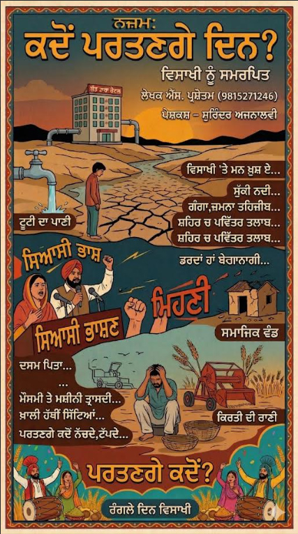 धालीवाल ने माजा विरासत ट्रस्ट के प्रधान और शायर एस. प्रशोतम द्वारा रचित और जारी की गई नज़्म ‘कदों परतणगे दिन?’ तथा रंगीन पोस्टर का विशेष उल्लेख करते हुए कहा कि इस नज़्म में प्रदूषित वैश्वीकरण के कारण मरती और सूखती झीलों, तालाबों, नदियों और नालों की पुनर्स्थापना के बजाय उनके अस्तित्व को समाप्त करने के लिए सूखी झीलों और नदी क्षेत्रों में बनाए जा रहे रंगीन मिज़ाज होटलों और रेस्टोरेंटों, राजनीतिक लालच के कारण भारतीय संस्कृति में उभर रही सांप्रदायिकता तथा बैसाखी के अवसर पर लगने वाले राजनीतिक मंचों से दशमेश पिता गुरु गोबिंद सिंह द्वारा सामाजिक विभाजन के अंत और भाईचारे की पुनर्स्थापना के लिए उठाई गई आवाज़ को बुलंद करने के बजाय राजनीतिक दलों द्वारा एक-दूसरे पर राजनीतिक प्रहार करने जैसी प्रवृत्तियों को अत्यंत काव्यात्मक और शायराना स्पर्श दिया गया है।