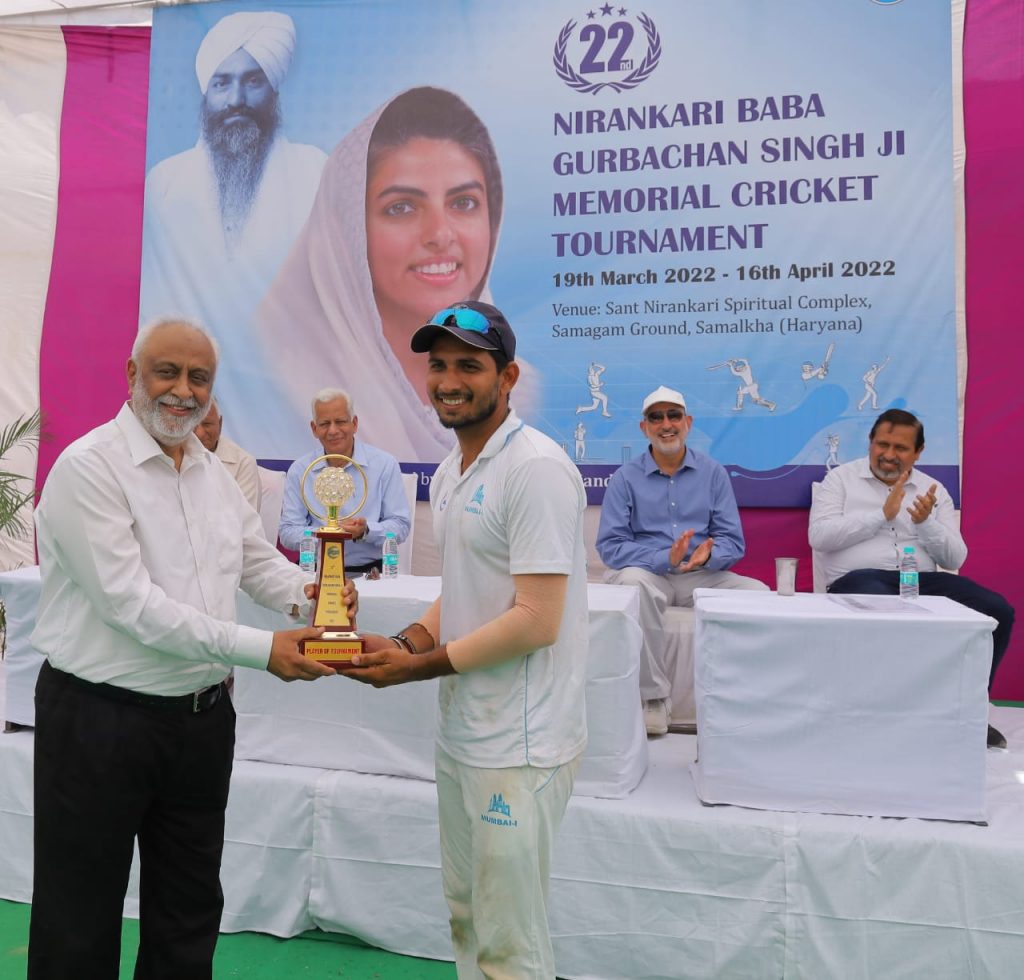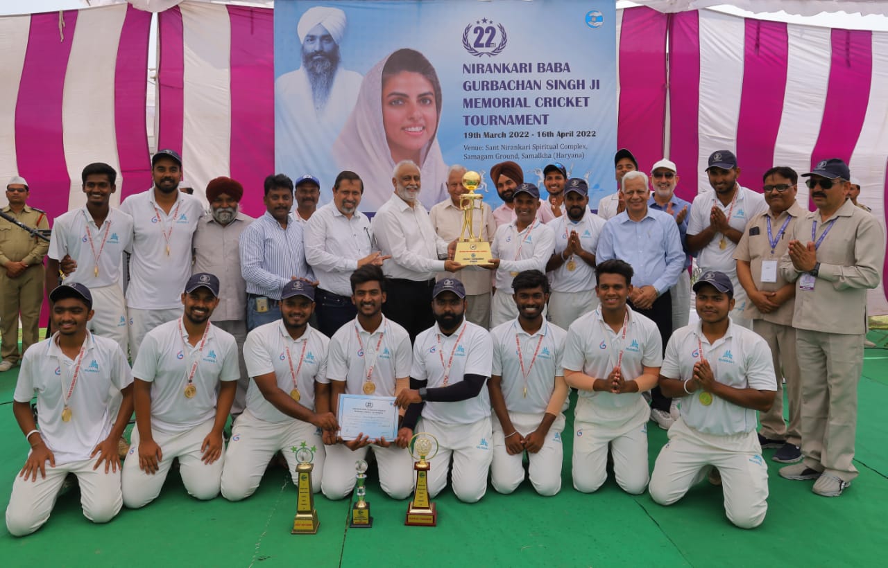कल्याण केसरी न्यूज़ समालखा ,16 अप्रैल, 2022ः -सत्गुरू माता सुदीक्षा जी महाराज की असीम कृपा द्वारा 22वें निरंकारी बाबा गुरबचन सिंह मेमोरियल क्रिकेट टुर्नामेंट का सफलतापूर्वक समापन आज आध्यात्मिक स्थल समालखा ग्राउंड में हुआ; जिसका शुभारम्भ दिनांक 19 मार्च, 2022 को हुआ था। इस प्रतियोगिता में देश के लगभग सभी राज्यों से 115 टीमों का रजिस्ट्रेशन किया गया जिनमें से मुख्यतः 48 टीमें चयनित हुई और सभी ने खेलों के माध्यम द्वारा महत्वपूर्ण अनुभवों एवं शिक्षाओं को ग्रहण किया।
