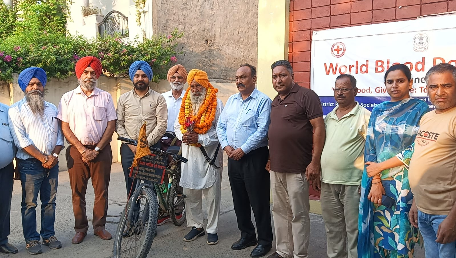 कल्याण केसरी न्यूज़ अमृतसर 17 जून 2025:पांच तख्तों की साइकिल यात्रा कर अमृतसर लौटे सरदार मंगल सिंह हुंदल जब रेडक्रॉस भवन पहुंचे तो जिला प्रशासन, सरदार खुशप्रीत सिंह एसडीएम मजीठा और सचिव रेडक्रॉस श्री सैमसन मसीह, टीपीएस संधू सेवानिवृत्त एडीसी, रेडक्रॉस टीम और शहर के गणमान्य लोगों ने उनका स्वागत किया। उन्होंने कहा कि इस यात्रा के दौरान मैंने युवाओं को नशे से दूर रहने और अपने स्वास्थ्य पर ध्यान देने का संदेश दिया। एसडीएम सरदार खुशप्रीत सिंह ने युवाओं को ऐसे बुजुर्गों से प्रेरणा लेने का संदेश देते हुए कहा कि यह हमारे लिए गर्व की बात है कि हमारे शहर निवासी मंगल सिंह अकेले ही 5000 किलोमीटर साइकिल यात्रा करके आए हैं।