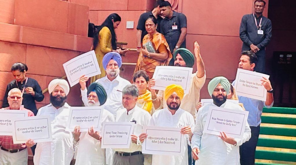 कल्याण केसरी न्यूज़, अमृतसर, 24 जुलाई 2025: पंजाब, हरियाणा और चंडीगढ़ के कांग्रेस सांसदों ने गुरुवार को दिल्ली में संसद भवन परिसर के बाहर मकर द्वार पर प्रदर्शन किया। यह विरोध गोल्डन टेंपल को मिली धमकियों के मुद्दे पर था।