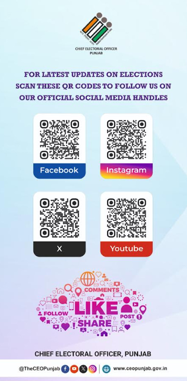 क्यूआर कोड स्कैन करें और मुख्य चुनाव कार्यालय पंजाब के सोशल मीडिया से जुड़ें