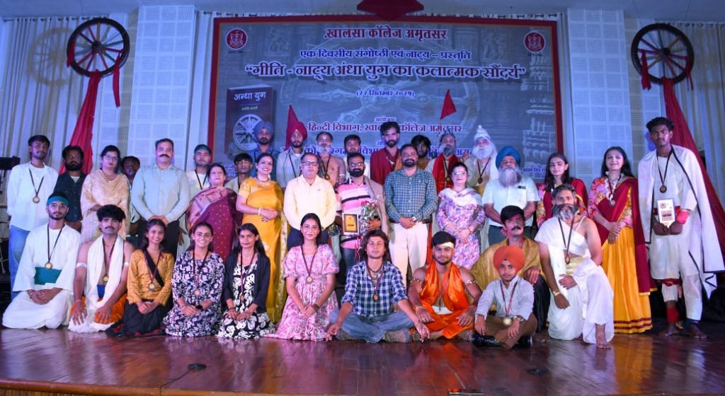 कल्याण केसरी न्यूज़, अमृतसर, 24 सितंबर 2025: खालसा कॉलेज अमृतसर के हिंदी विभाग ने कॉलेज के रंगमंच अध्ययन विभाग के सहयोग से क्लासिक हिंदी नाटक अंधा युग पर एक संगोष्ठी और उसकी नाट्य प्रस्तुति का आयोजन किया। मुख्य वक्ता, डॉ. सुनील, जो हिंदी विभागाध्यक्ष और जीएनडीयू के डीन भाषाएँ हैं, ने छात्रों को धर्मवीर भारती के योगदान के बारे में जानकारी देते हुए, उनके नाटक अंधा युग की प्रासंगिकता पर प्रकाश डाला। युद्ध की निरर्थकता पर ज़ोर देते हुए उन्होंने कहा कि जब मनुष्य की बुद्धि अन्धी हो जाती है तो कोई भी युग या समय अंधा युग बन जाता है। कॉलेज के प्राचार्य डॉ. आत्म सिंह रंधावा ने अतिथि वक्ताओं का स्वागत करते हुए हिंदी सप्ताह उत्सव -2025के दौरान युद्ध विषय पर विचार-विमर्श और इस विषय पर प्रतियोगिता आयोजित करने के लिए हिंदी विभाग को बधाई दी। उन्होंने कहा कि वर्तमान अंतर्राष्ट्रीय परिदृश्य के संदर्भ में छात्रों को शांति की आवश्यकता के प्रति संवेदनशील बनाया जाना चाहिए। प्रोफेसर विशाल शर्मा के निर्देशन में हिन्दी तथा रंगमंच विभाग द्वारा नाटक की सुंदर प्रस्तुति ने दर्शकों को मंत्रमुग्ध कर दिया। डॉ. पूनम महाजन और रंगकर्मी गुरतेज मान ने कलाकारों में से सर्वश्रेष्ठ कलाकारों का चयन किया। डॉ. महाजन ने विभाग को बधाई देते हुए इस क्लासिक नाटक के नाटकीय पहलुओं पर प्रकाश डाला। हिंदी विभागाध्यक्ष डॉ. सुरजीत कौर ने हिंदी सप्ताह उत्सव -2025 की रिपोर्ट प्रस्तुत की, जिसमें विद्यार्थियों ने निबंध लेखन सहित विभिन्न प्रतियोगिताओं में भाग लिया। विजेता विद्यार्थियों और सर्वश्रेष्ठ प्रदर्शन करने वालों को नकद पुरस्कार के साथ सम्मानित किया गया। कॉलेज के डिप्टी रजिस्ट्रार डॉ. दीपक देवगन ने धन्यवाद प्रस्ताव प्रस्तुत किया। इस अवसर पर रजिस्ट्रार डॉ. देवेंद्र सिंह, डीन छात्र कल्याण डॉ. दलजीत सिंह, डीन छात्र कल्याण डॉ. स्वराज कौर, डीन भाषाएं प्रोफेसर सुपनिन्दर कौर और अन्य संकाय सदस्य भी उपस्थित थे।
