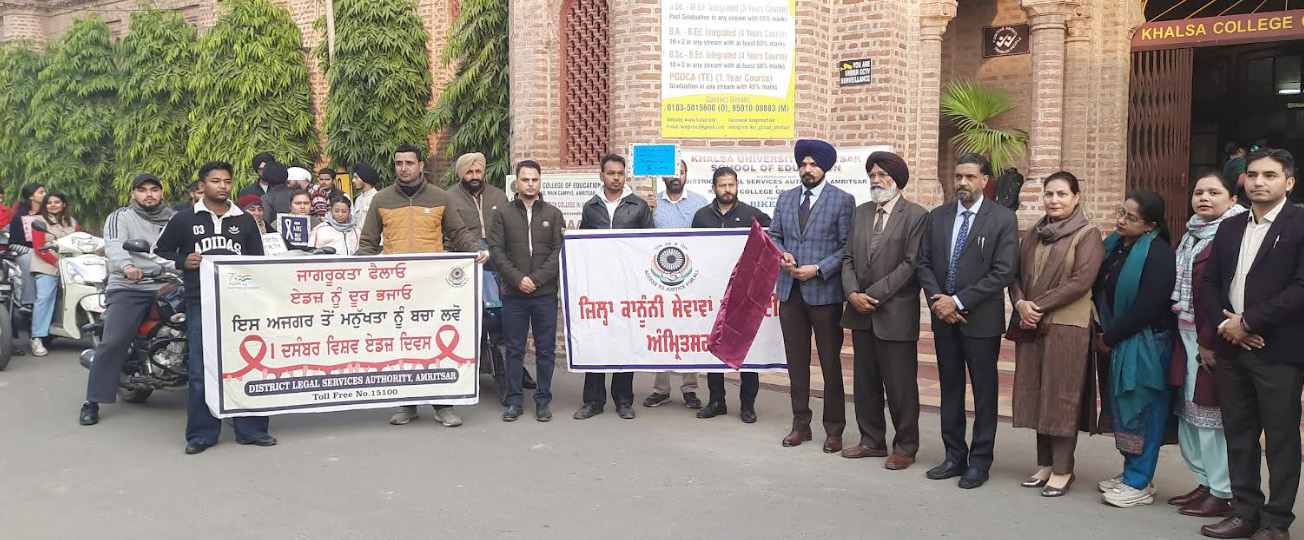 कल्याण केसरी न्यूज़, अमृतसर, 1 दिसंबर 2025: मिस्टर जस्टिस अश्वनी कुमार मिश्र, माननीय जज पंजाब एवं हरियाणा हाई कोर्ट तथा कार्यकारी चेयरमैन, पंजाब राज्य कानूनी सेवाएं प्राधिकरण, एस.ए.एस. नगर (मोहाली) के मार्गदर्शन में, माननीय मेंबर सेक्रेटरी पंजाब स्टेट लीगल सर्विसेज अथॉरिटी, एस.ए.एस. नगर के निर्देशों एवं माननीय जिला एवं सैशंस जज-कम-चेयरपर्सन, जिला कानूनी सेवाएं अथॉरिटी, अमृतसर की देख-रेख में, खालसा कॉलेज ऑफ एजुकेशन, अमृतसर तथा खालसा यूनिवर्सिटी, अमृतसर के सहयोग से विश्व एड्स दिवस पर एच.आई.वी./एड्स जागरूकता कैंपेन के अंतर्गत एक विशाल एच.आई.वी./एड्स जागरूकता एवं नशा मुक्ति बाइक रैली आयोजित की गई। इस रैली का उद्देश्य युवाओं एवं समाज को एच.आई.वी./एड्स की रोकथाम और नशा मुक्ति प्रयासों में सक्रिय भागीदारी के लिए प्रेरित करना था।