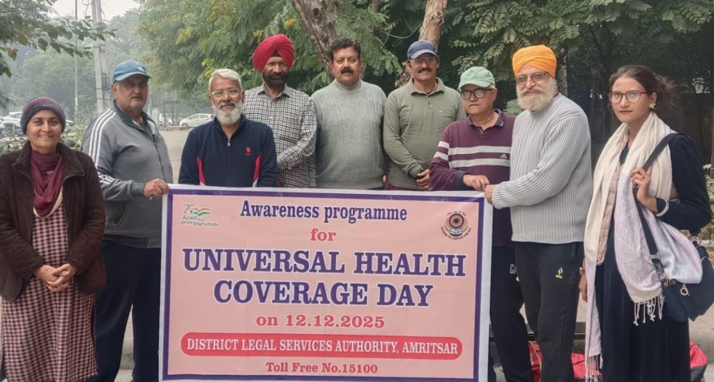 कल्याण केसरी न्यूज़, अमृतसर, 12 दिसंबर 2025: माननीय न्यायमूर्ति अश्वनी कुमार मिश्र, पंजाब एवं हरियाणा उच्च न्यायालय के माननीय न्यायाधीश तथा कार्यकारी अध्यक्ष, पंजाब राज्य विधिक सेवाएँ प्राधिकरण, एस.ए.एस. नगर (मोहाली) के मार्गदर्शन में तथा माननीय सदस्य सचिव, पंजाब राज्य विधिक सेवाएँ प्राधिकरण, एस.ए.एस. नगर के निर्देशों और माननीय जिला एवं सत्र न्यायाधीश–कम–अध्यक्ष, जिला विधिक सेवाएँ प्राधिकरण, अमृतसर के नेतृत्व में जिला विधिक सेवाएँ प्राधिकरण (डी.एल.एस.ए.), अमृतसर द्वारा यूनिवर्सल स्वास्थ्य कवरेज दिवस के अवसर पर जागरूकता और कानूनी साक्षरता संबंधी अनेक गतिविधियों का आयोजन किया गया।
