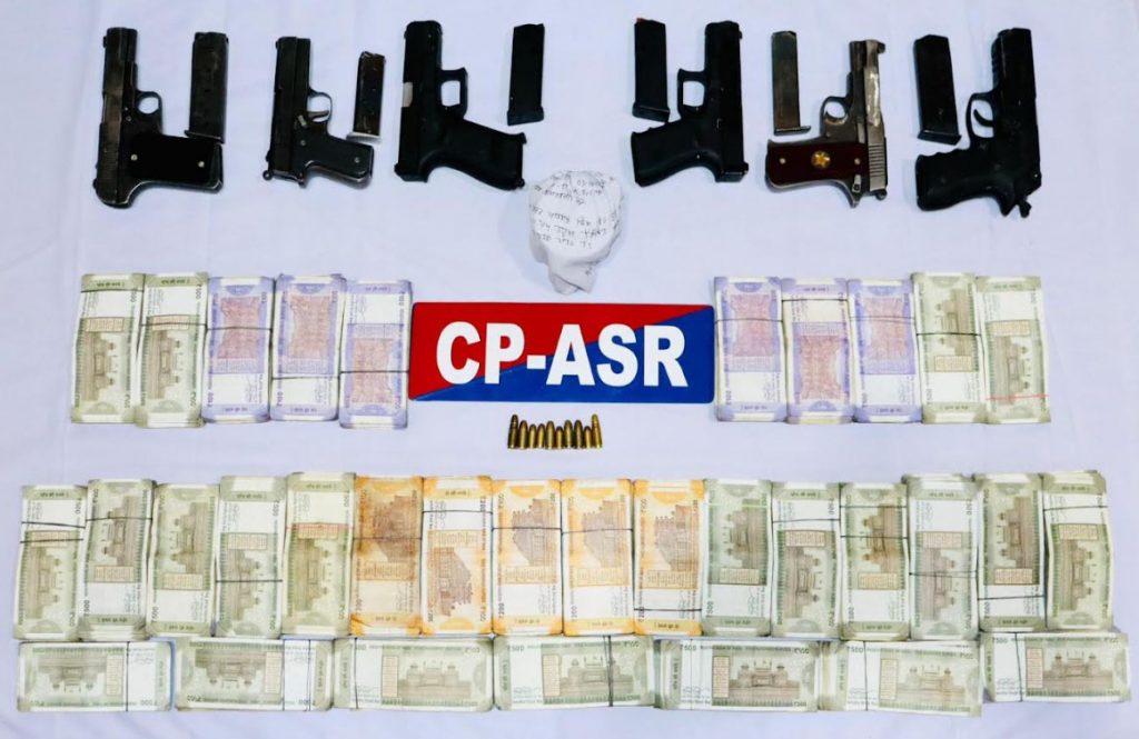 पुलिस आयुक्त (सी.पी.) अमृतसर गुरप्रीत सिंह भुल्लर ने कार्रवाई के संबंध में विवरण साझा करते हुए कहा कि सीमा पार तस्करी संबंधों की पुख्ता एवं गुप्त सूचना पर कार्रवाई करते हुए पुलिस टीमों ने सिमरनजीत उर्फ मन्नू, मोलकदीप सिंह, गुरप्रीत उर्फ गोपी, सुखराज उर्फ जोगा और साजन उर्फ गुरसाजन उर्फ लड्डा को एक कार सहित गिरफ्तार किया है और उनके कब्जे से दो .32 बोर पिस्तौल बरामद किए हैं। उन्होंने कहा कि आगे की पूछताछ के बाद हुई बरामदगी के दौरान चार अन्य पिस्तौल, 115 ग्राम हेरोइन और 11.90 लाख रुपये की ड्रग मनी जब्त की गई, जो संगठित अवैध हथियारों और नशीले पदार्थों की गतिविधियों में उनकी संलिप्तता की पुष्टि करती है।